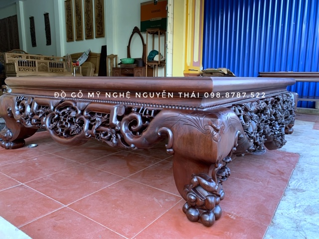 Chất liệu gỗ gụ gia lai nặng chắc, bền bỉ loại bỏ sạch rác không dập nứt, đạt tiêu chuẩn 100%. Kích thước 2m2 x1m8 chân vuông 24cm bệ tiền cực dày 10cm bệ ngang 8cm. Sản xuất mới, chạm tay 100% hoàn thiện kỹ vecli trần gỗ, tự nhiên thật màu gỗ, bền màu theo thời gian, cam kết không phun PU.