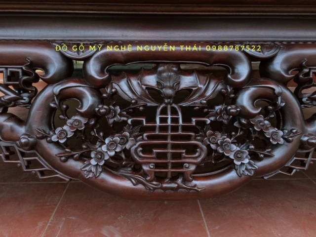 Sập Ngũ Phúc Với hình tượng chủ đạo Ngũ Phúc Thọ Dơi – Ngũ Phúc Kim Tiền . Mang ý nghĩa Trường Thọ Phú Quý Và May Mắn cho gia chủ sở hữu. Ngoài Ra các đường nét đục của mẫu sập này còn có hình ảnh quả trám . Tượng Trưng cho khí chất của người quân tử . Hơn Nữa ở 2 bên cạnh của chữ Phúc các nghệ nhân đã rất khéo léo. Lồng ghép hình tượng mai điểu mang ý nghĩa sum vầy hạnh phúc sự hoà hợp vợ chồng.