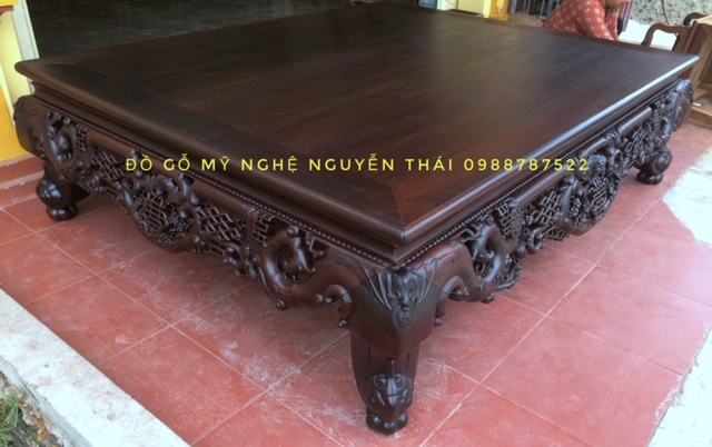 – kích thước dài 2m x rộng 1m6, mặt sập lá đôi dày 2cm, chân 18cm - Chạm tam diện khắc tinh sảo, chạm hai mặt, không chắp ghép.